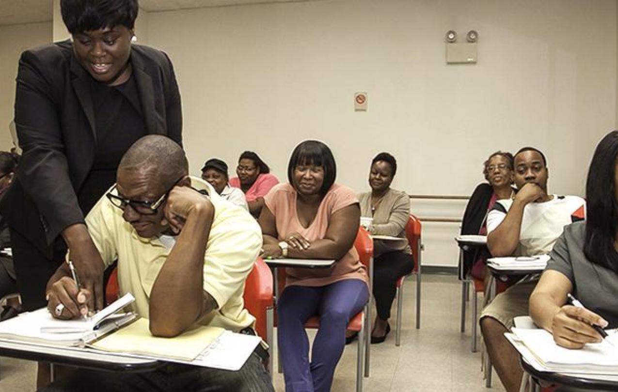 DC37 EdFund trainer, Claire Menelas, guides shop steward Kevin Bowers through a section of the training manual.